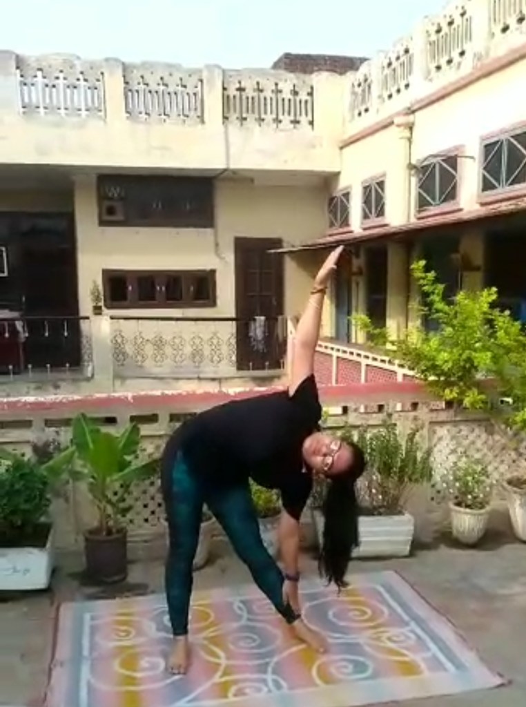 PROCEDURE – Stand erect with legs apart, arms stretched to shoulder level , turning right foot toward right side and keeping right palm beside it by bending side and gazing at fingers of other hand.